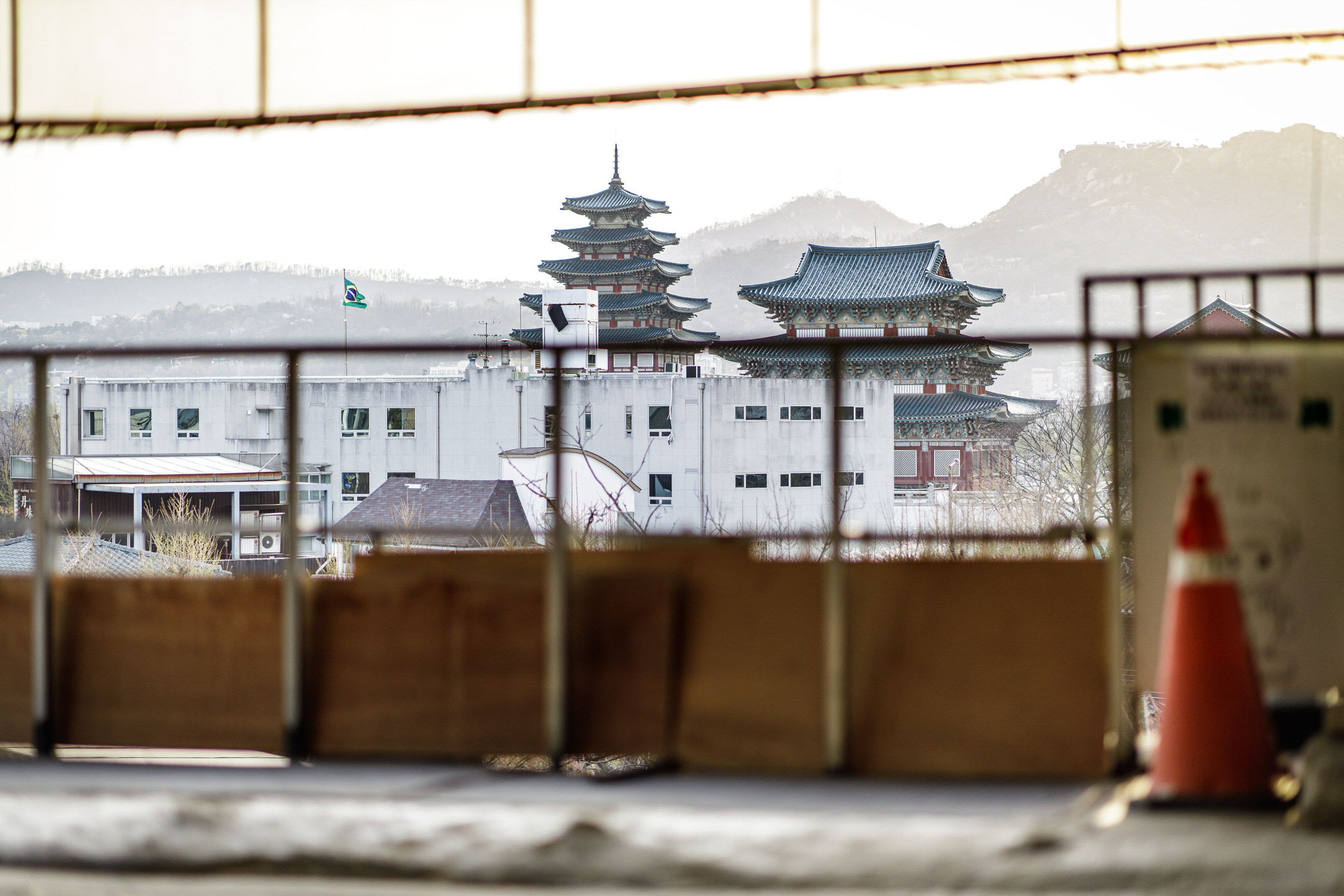 On the left, the National Folk Museum of Korea, located on the grounds of Gyeongbokgung Palace and topped with a pagoda, is seen from a construction site on the edge of Bukchon.