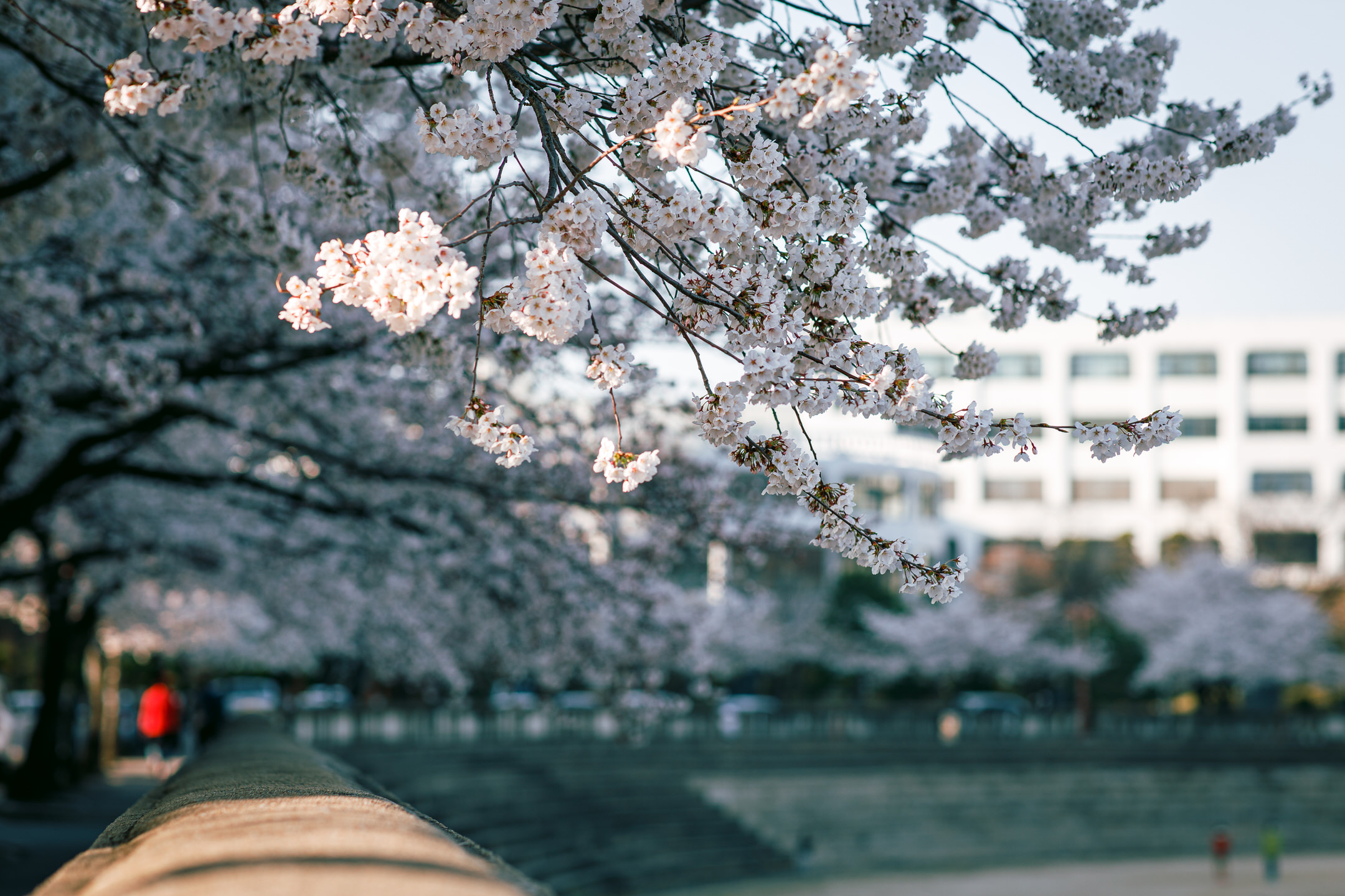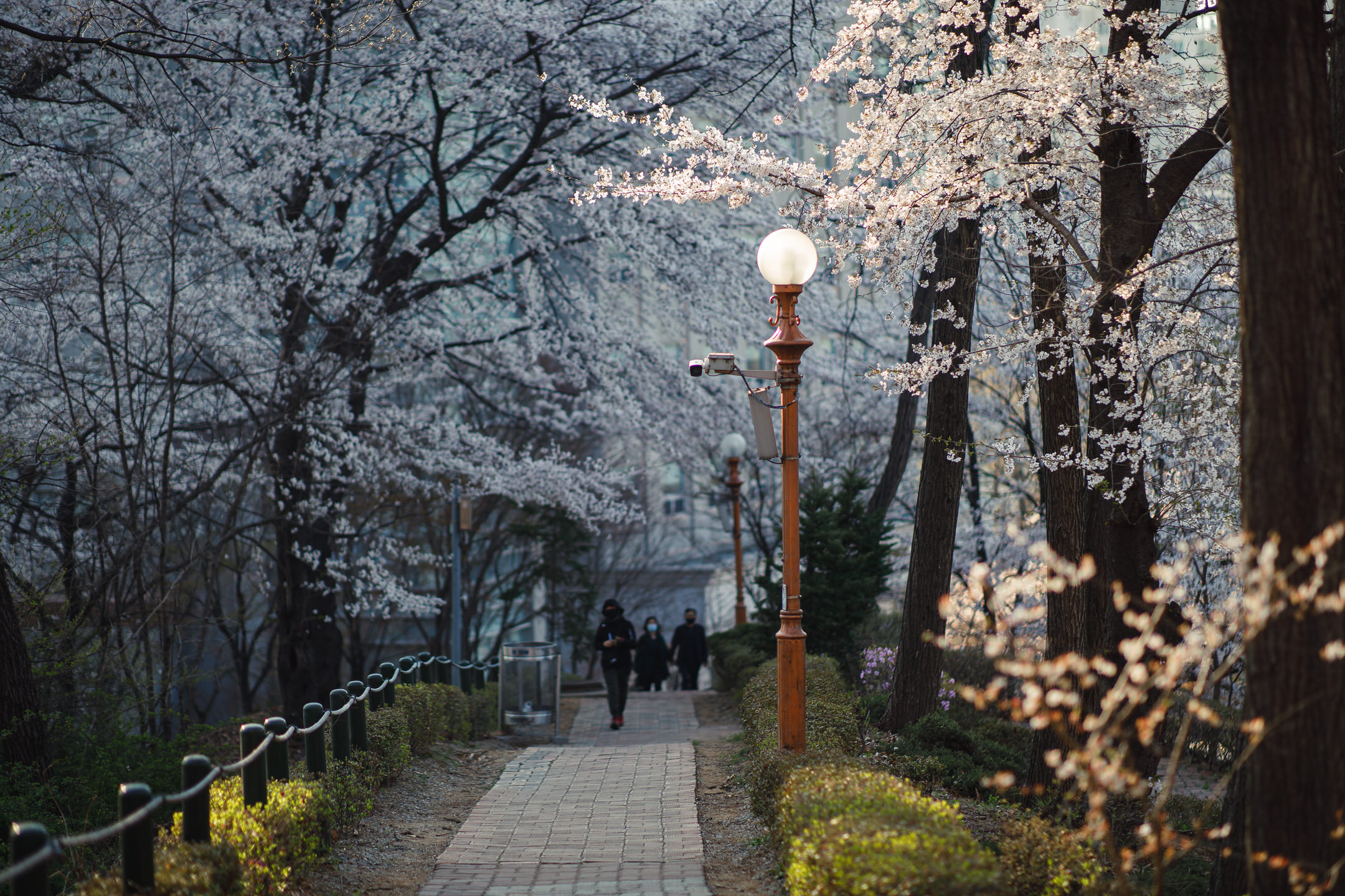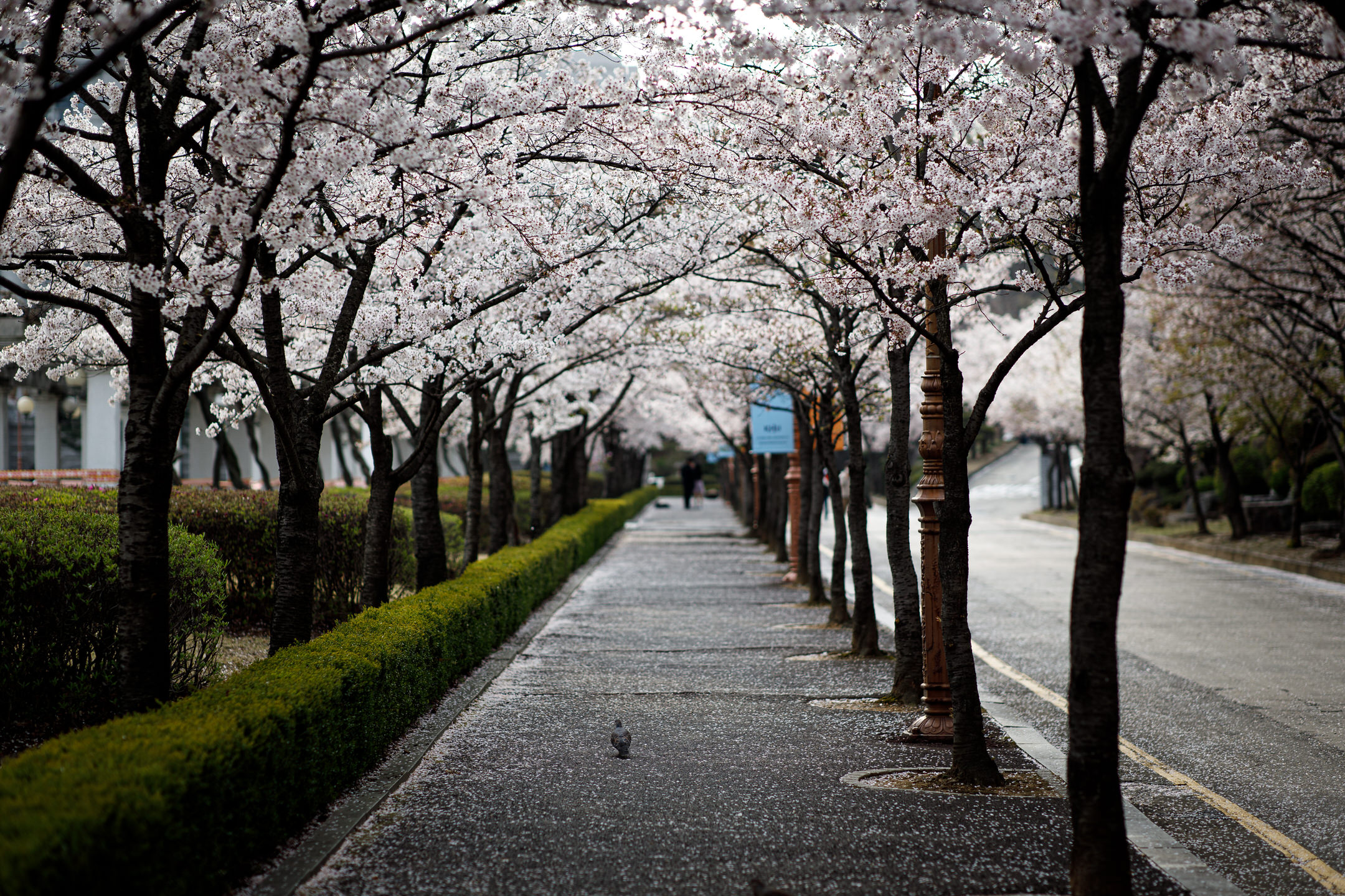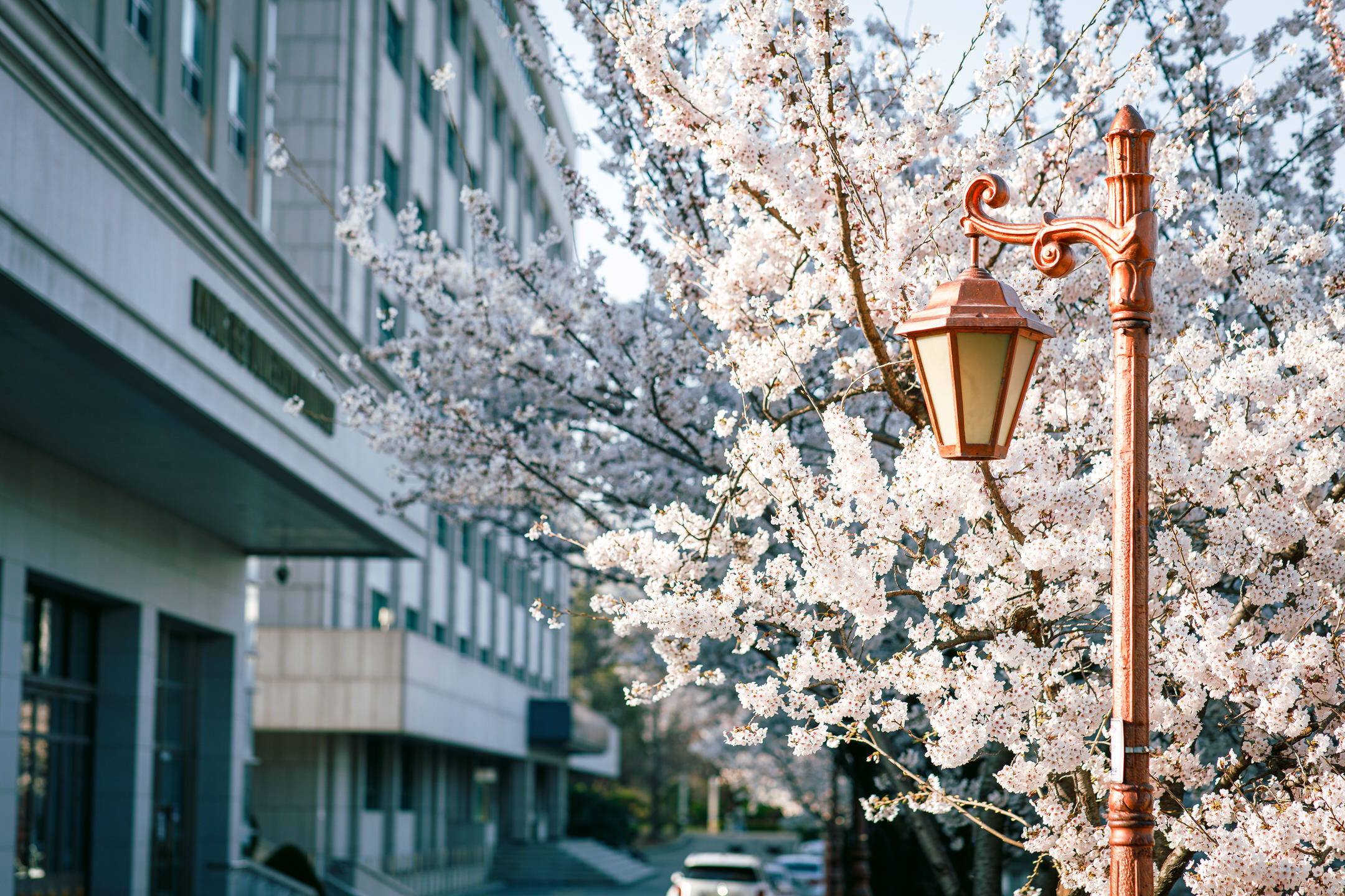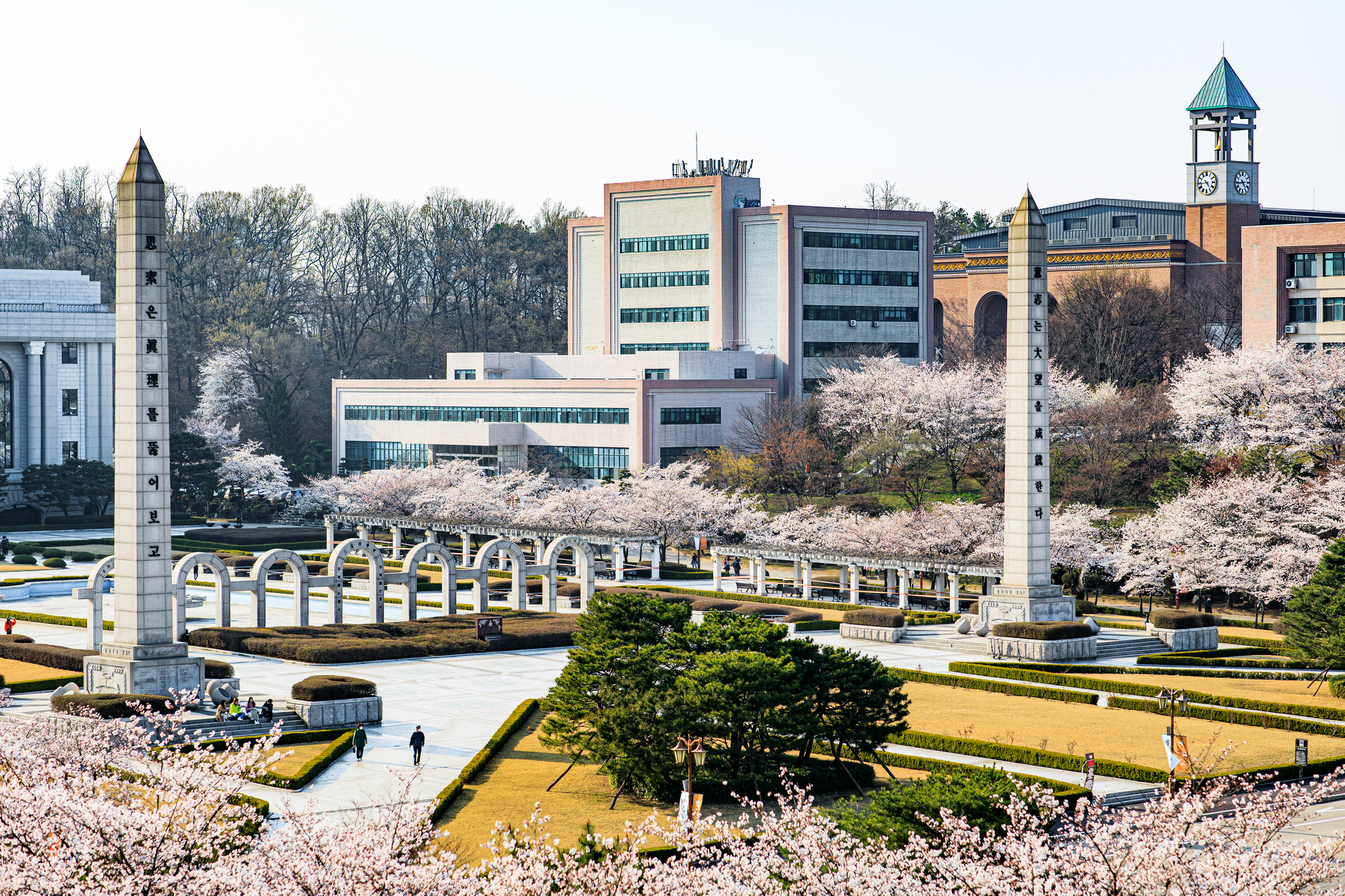 The area around the library is particularly enchanting with its two long, cherry blossom-covered sidewalks on each side of the Pensée Plaza, and many students and locals can be seen here enjoying the full bloom of the trees and taking some seasonal selfies. Here is one of the two long sidewalks in front of Kyung Hee University’s library that is covered by cherry trees: